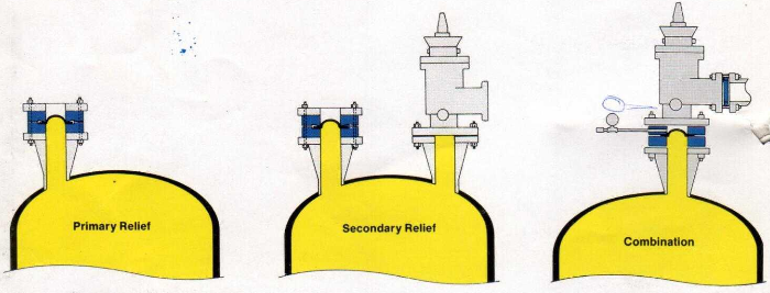 Typically , Rupture Disc Applications fall into one of the following categories Primary Relief: Where a Pressure Relief device is Used as the Primary or Sole Relieving device, a rupture disc may be used as the only means of over-presssure protection. Secondary Relief: The Rupture disc devices may be used to Provide secondary relief to other rupture discs or Pressure relief valves. Combination: The rupture disc device is Located between a pressure relief valve and the Process thus preventing leakage or weeping through the pressure relief valve.